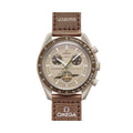 Die Swatch x Omega Bioceramic Moonswatch Mission to Saturn (SO33T10) hat ein braunes Zifferblatt und ein Klettband, was einen Kontrast zu Sand- und Beigetönen bildet. Die Uhr verfügt über ein zusätzliches Merkmal im Vergleich zu anderen Modellen der Zusammenarbeit: die Ringe des Saturns auf den Sekundenzeigern. Die Swatch x Omega Mission to Saturn (SO33T10) hat ein Quarzuhrwerk, ist bis 3 bar wasserdicht und zeigt die ikonischen Details der originalen Moonswatch von Omega.